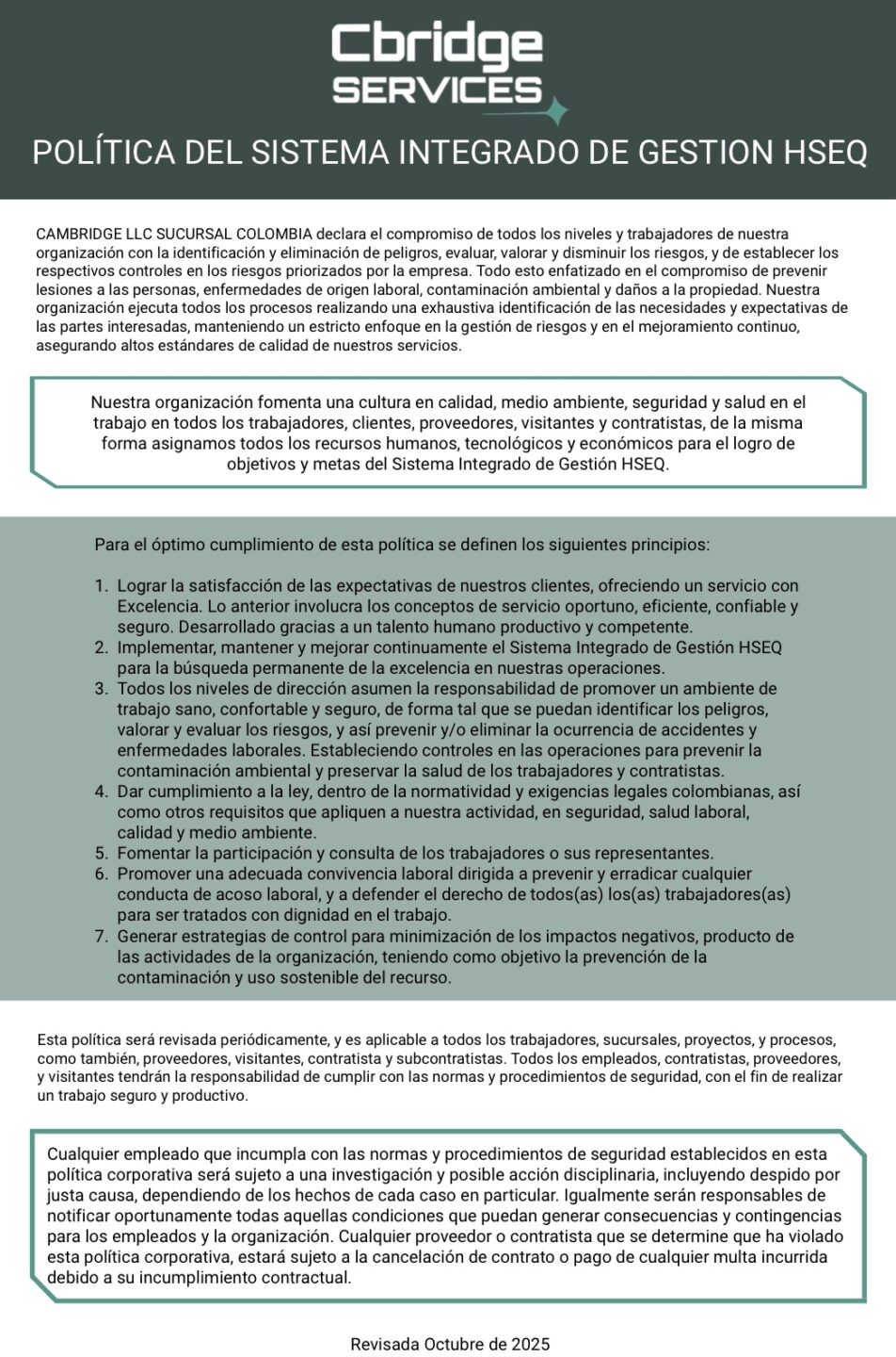 Cambridge declara su compromiso de todos los niveles y trabajadores de nuestra organización con la identificación de peligros, evaluar y valorar los riesgos, y de establecer los respectivos controles en los riesgos priorizados por la empresa. Todo esto enfatizado en el compromiso de prevenir lesiones a las personas, enfermedades de origen laboral, contaminación ambiental y daños a la propiedad.
